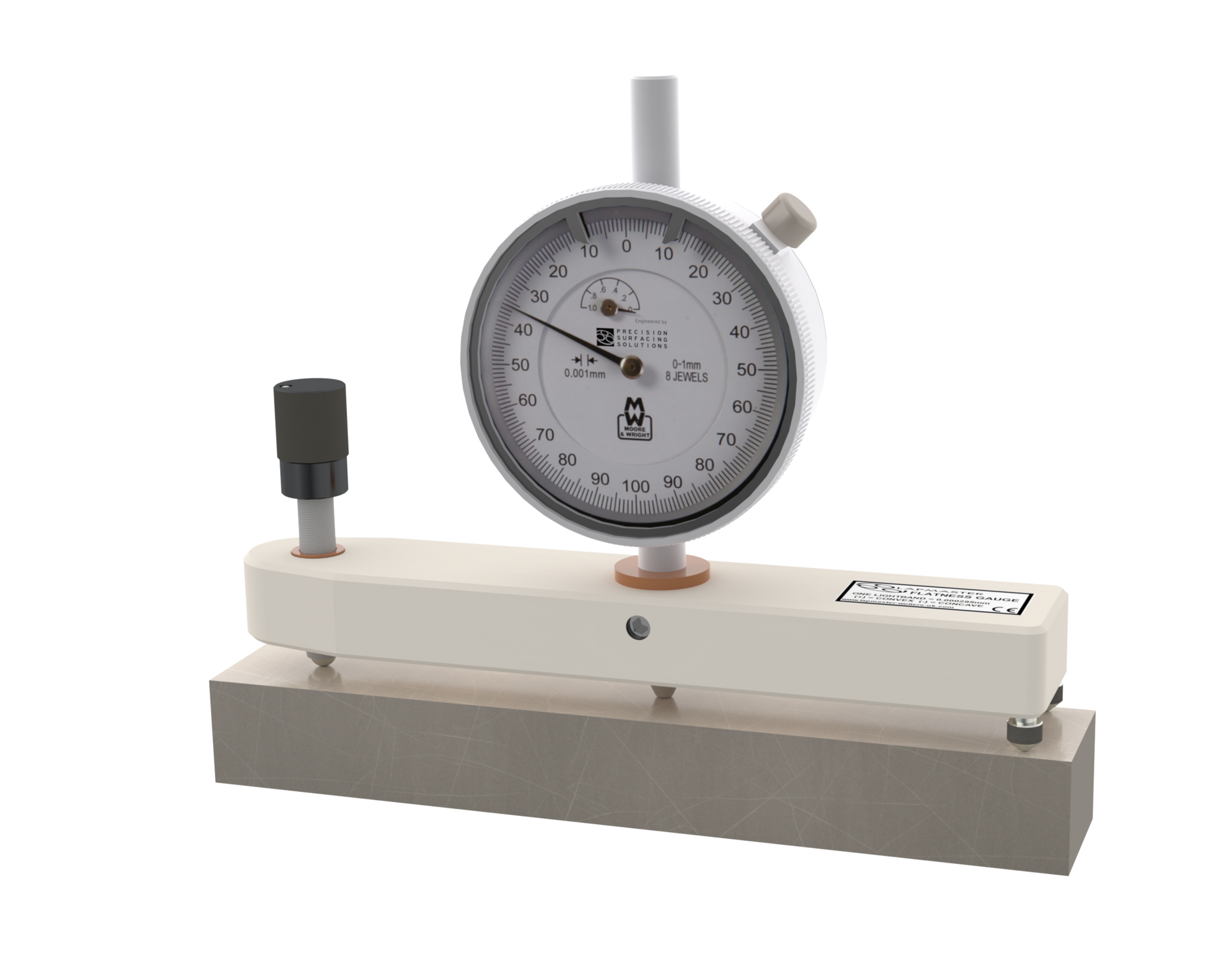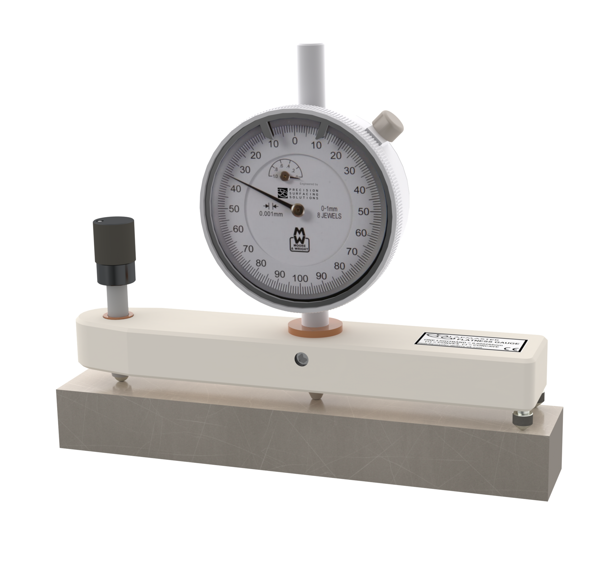 - Calibrate the Flatness Gauge by placing it onto the Master Block and zeroing the indicator needle to “0’’. This is done by adjusting knurled Adjusting Screw over the single front foot.